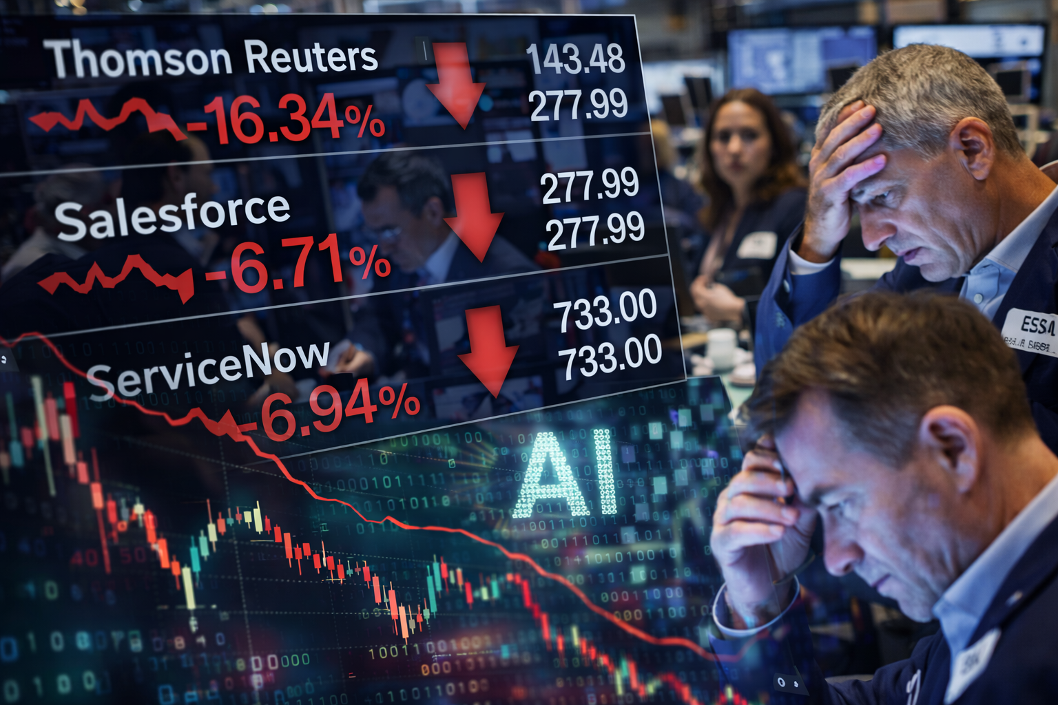 The pressure quickly spread to enterprise software giants. ServiceNow and Salesforce both dropped nearly 7%, underscoring the breadth of investor concern.